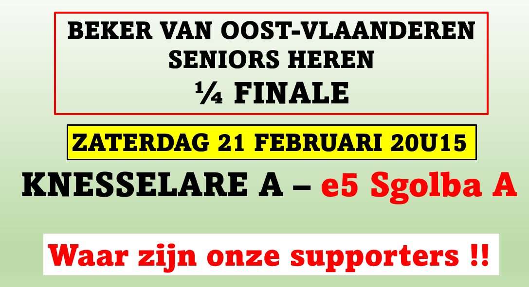 De thuisploeg verheugt zich in de komst van de buren uit Aalter. Voor staf, spelers, club en supporters is dit toch zowat het hoogtepunt van het jaar. We gaan hierboven al aan dat de onderlinge confrontaties altijd al voor een vol huis gespeeld worden. Knesselare probeert de poort naar eerste landelijke te ontgrendelen. De mannen van coach Nils Moortgat richten in de eerste plaats hun pijlen op de kompetitie. Dat neemt evenwel niet weg, dat zij tegen E5 Sgolba Aalter nog voor de volle buit willen gaan. De voorgift van 5 punten valt sowieso al niet te versmaden. Het aantreden in de eigen vertrouwde omgeving is dan het toetje bovenop.